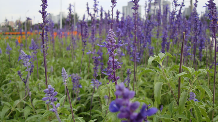 奥运建筑 >2 奥运村大道路边的紫色花 |