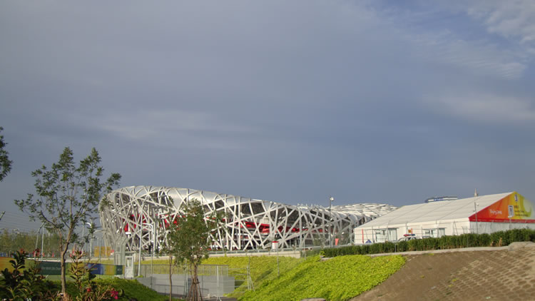 鸟巢旁边的像“棚子”的建筑是入口,估计是鸟巢运动员入场的地下通道。 |